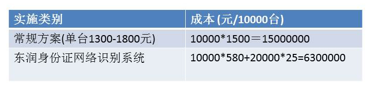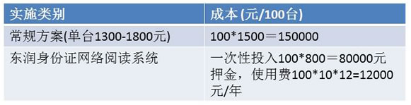 以10000个身份证阅读点且阅读频率较高为例,单机阅读模式和东润网络阅读模式(网络服务器用户自建,成本不超过20万)各自成本比较如下